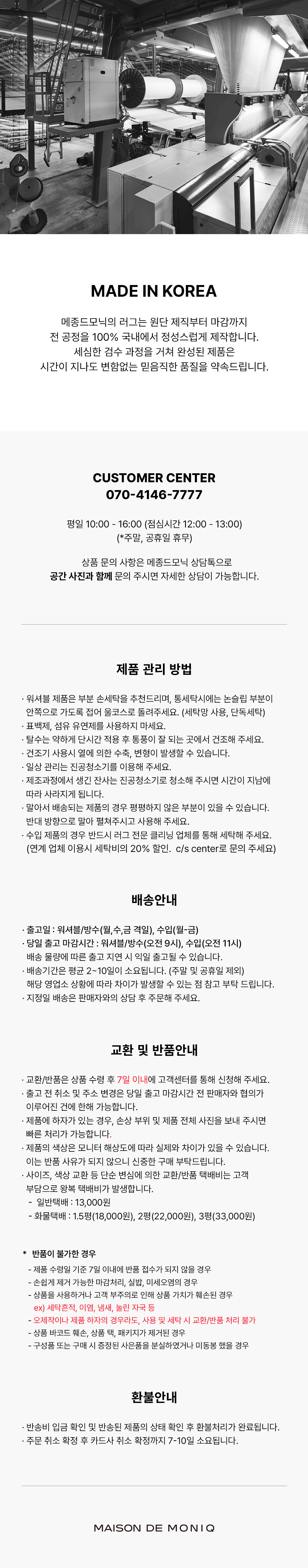 - 메종드모닉 지정 택배사를 이용해야 하므로, 반드시 고객센터를 통해 신청해 주시기 바랍니다.