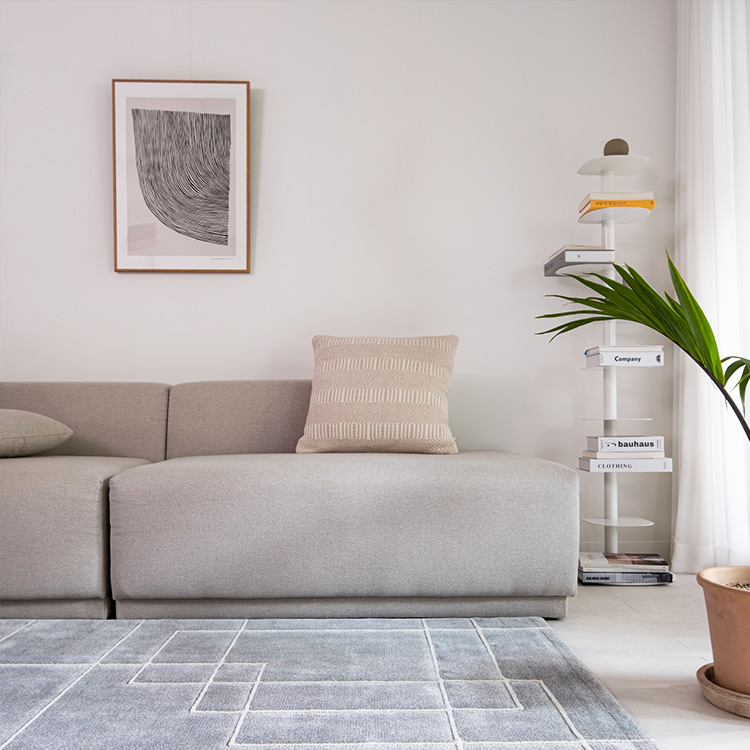 빛에 따라 입체적으로 보이는 양음각 짜임과 모던한 패턴이 공간을 고급스럽게 완성해줍니다. 초고밀도 벨기에산 단모로 부드럽고 정돈된 분위기를 연출할 수 있습니다.