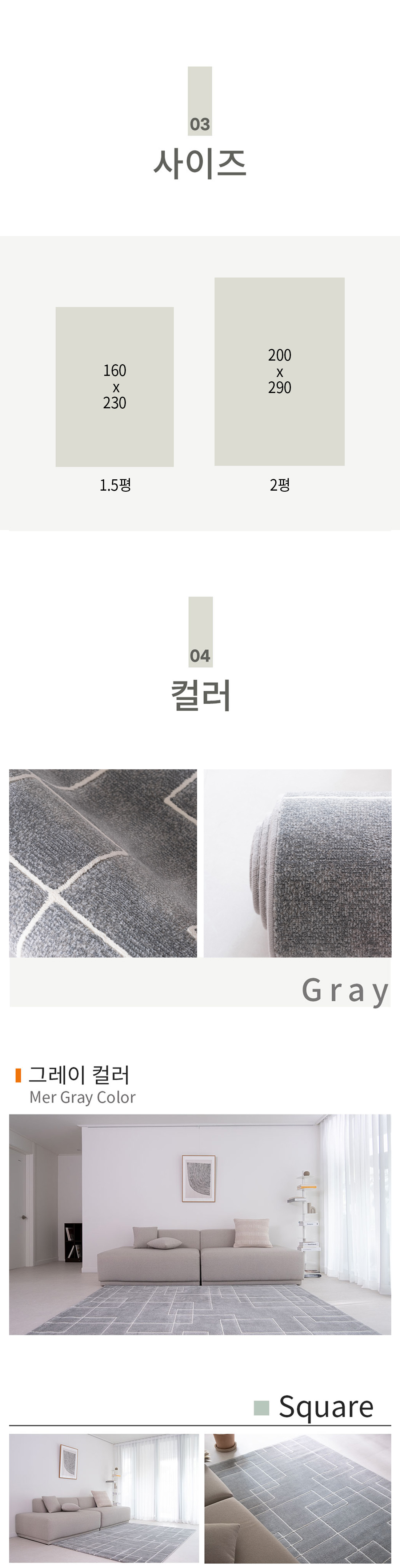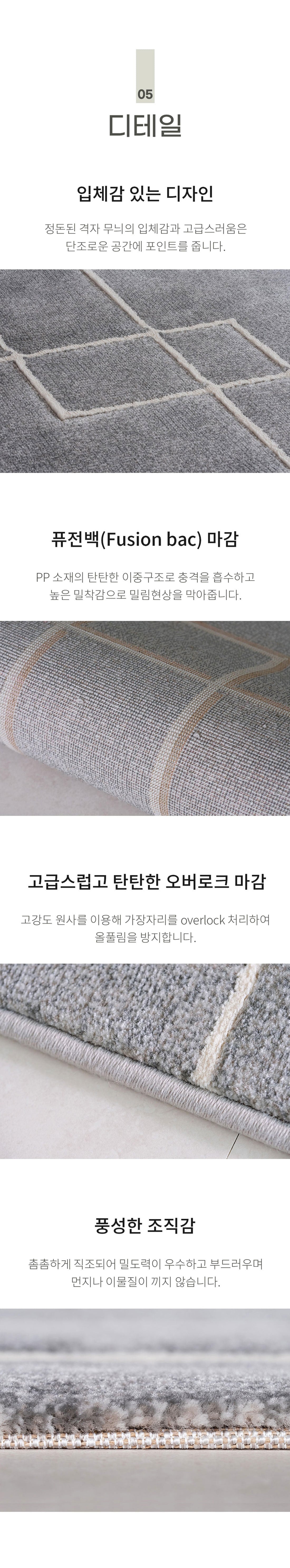 - 원단 특성상 러그 사이즈는 ±5cm의 오차 범위가 발생할 수 있습니다. 이 점 양해 부탁드리며, 구매 시 참고해 주세요.