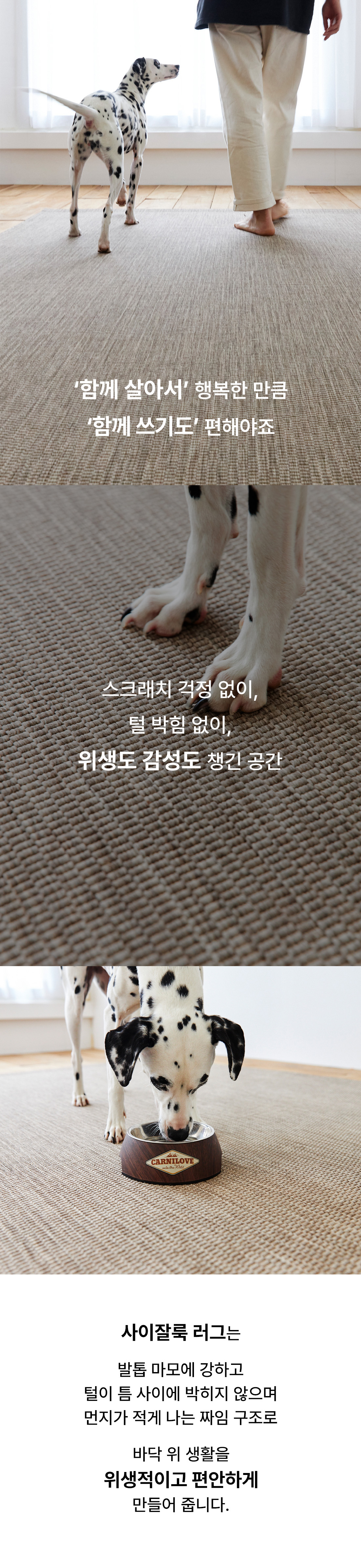 굵고 단정한 직선 패턴이 공간에 안정감을 더해주는 사이잘룩 러그 입니다. 먼지 걱정 없는 위생적인 소재로 반려가정에도 추천합니다.