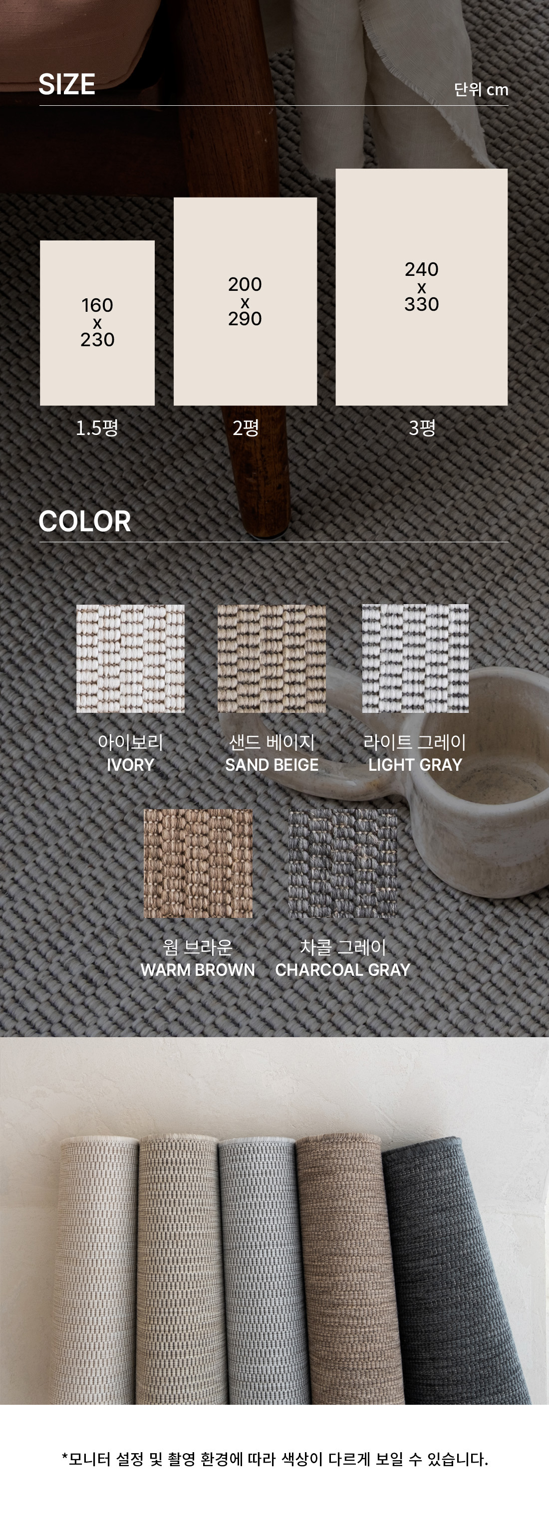 | 색상 | 아이보리, 샌드베이지, 라이트그레이, 웜브라운, 차콜그레이 |