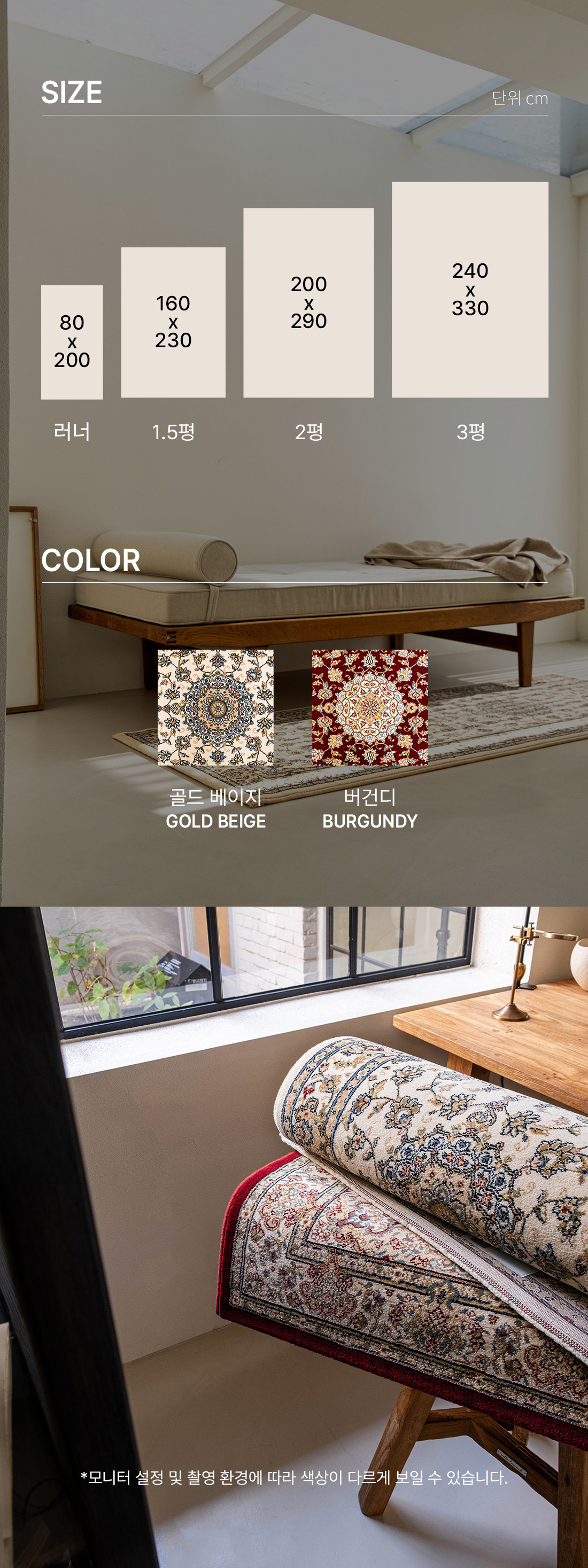 - 원단 특성상 러그 사이즈는 ±5cm의 오차 범위가 발생할 수 있습니다. 이 점 양해 부탁드리며, 구매 시 참고해 주세요.