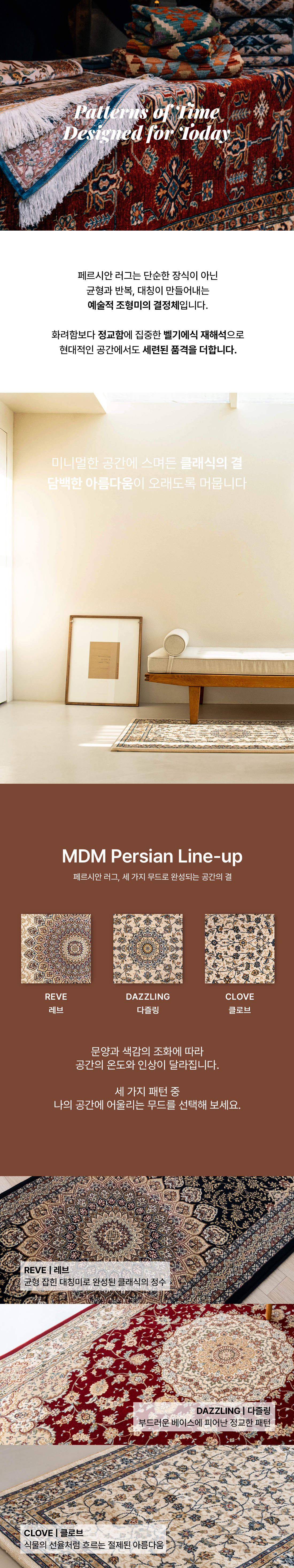 정교한 페르시안 패턴과 은은한 톤이 클래식한 무드를 완성합니다. 초고밀도 벨기에 파일러그로 실용성과 품격을 모두 담았습니다.